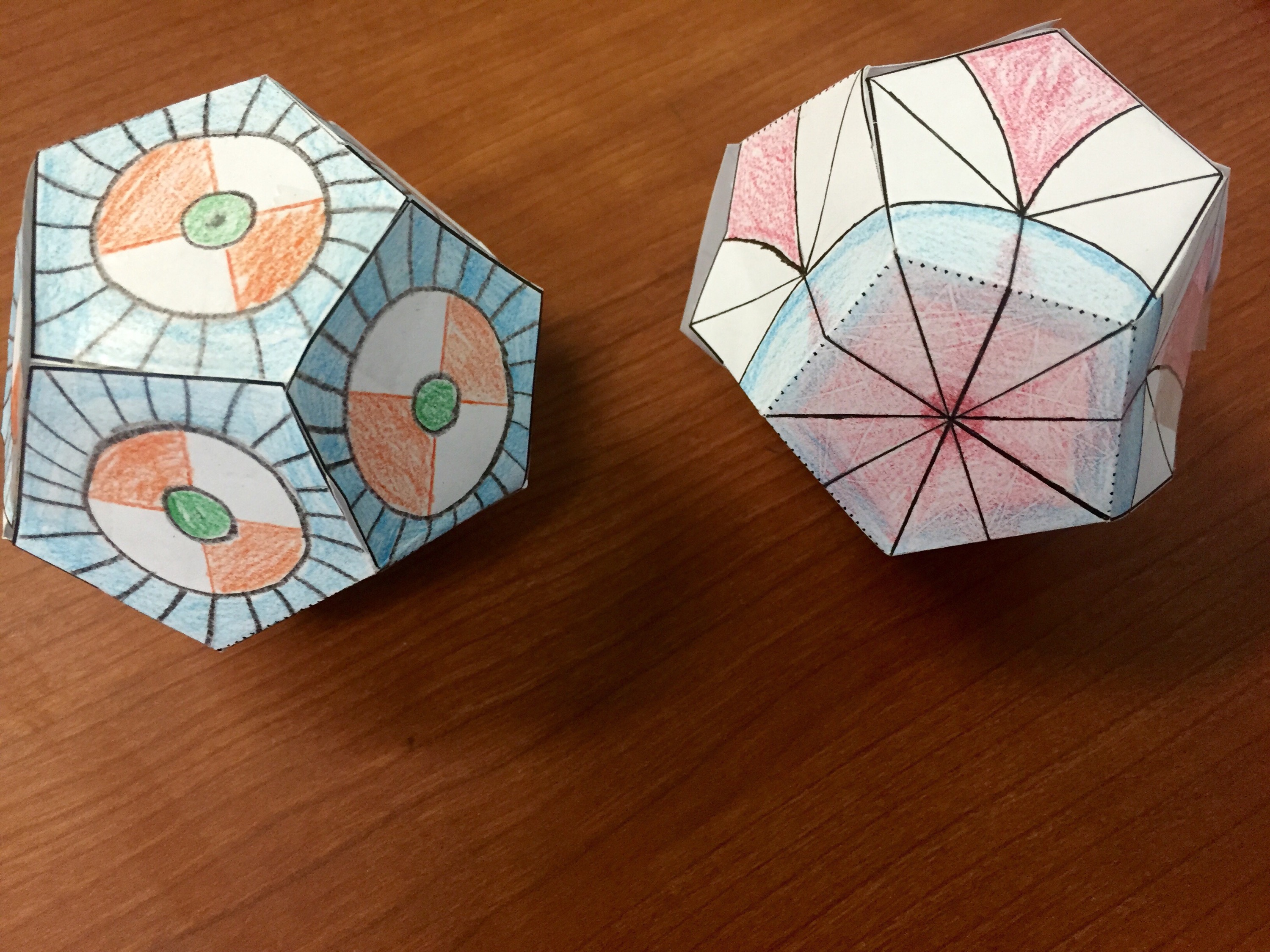 Overall, students enjoyed this hands on activity. One change I would make is to print out the larger nets rather than the single page nets, especially for the more complex types (anything larger than an octahedron) because folding and taping those got quite tricky! My plan is to hang these up with fishing wire between my room and the World History room as a visual connection between the two classes. Thanks, Mr. Sprott, for helping me dream up this mini-project!