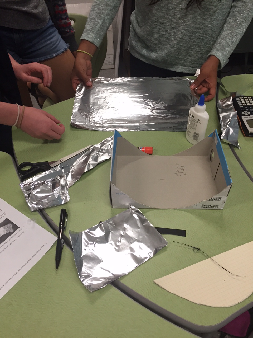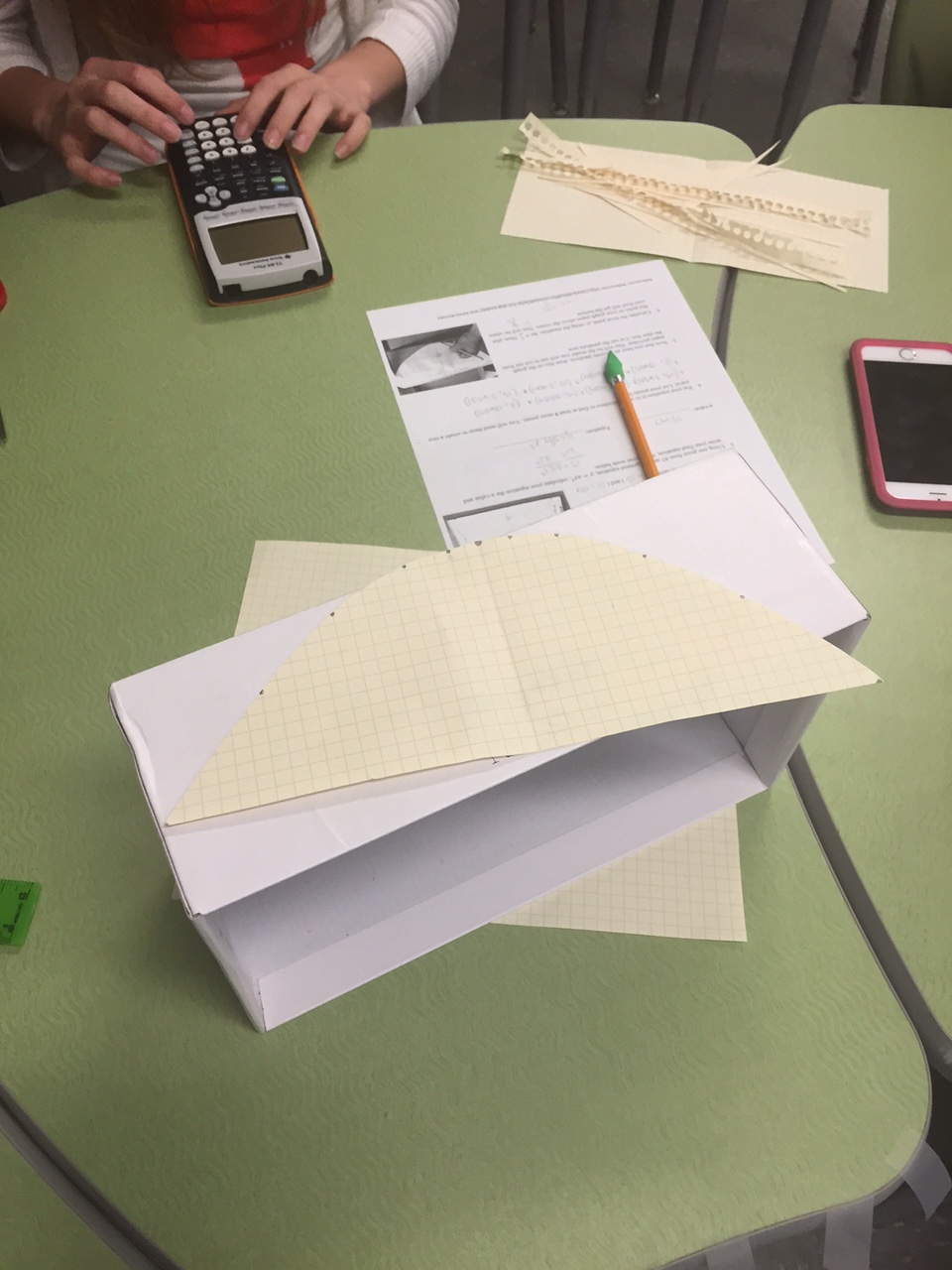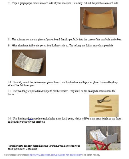 Summary: To begin the project, students spent a class day researching and answering questions about solar cookers. With the help of an actual solar energy engineer (see his website and work here: energyae.com) generating some ideas, the questions helped students buy in to the project (he also sent me some videos to show students real life parabolic solar panels…if you have Dropbox, check them out here: https://www.dropbox.com/home/SolarMrsTaplin). The next day, students found three points to create a parabolic curve based on the dimensions of their shoe box (two top corner points and one center origin point). From these, students calculated the equation and plotted other points to create a nice, accurate curve. Next, students calculated the focal point, which we talked about the reasoning as to why this is the spot they should place their food at to cook. Lastly, students covered their curves in poster board and foil for the reflective surface and fashioned holders for the focal point.