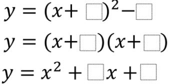 Algebra II: Create three equations that produce the exact same parabola by filling in the blanks with whole number 0 through 9, using each number at most once.