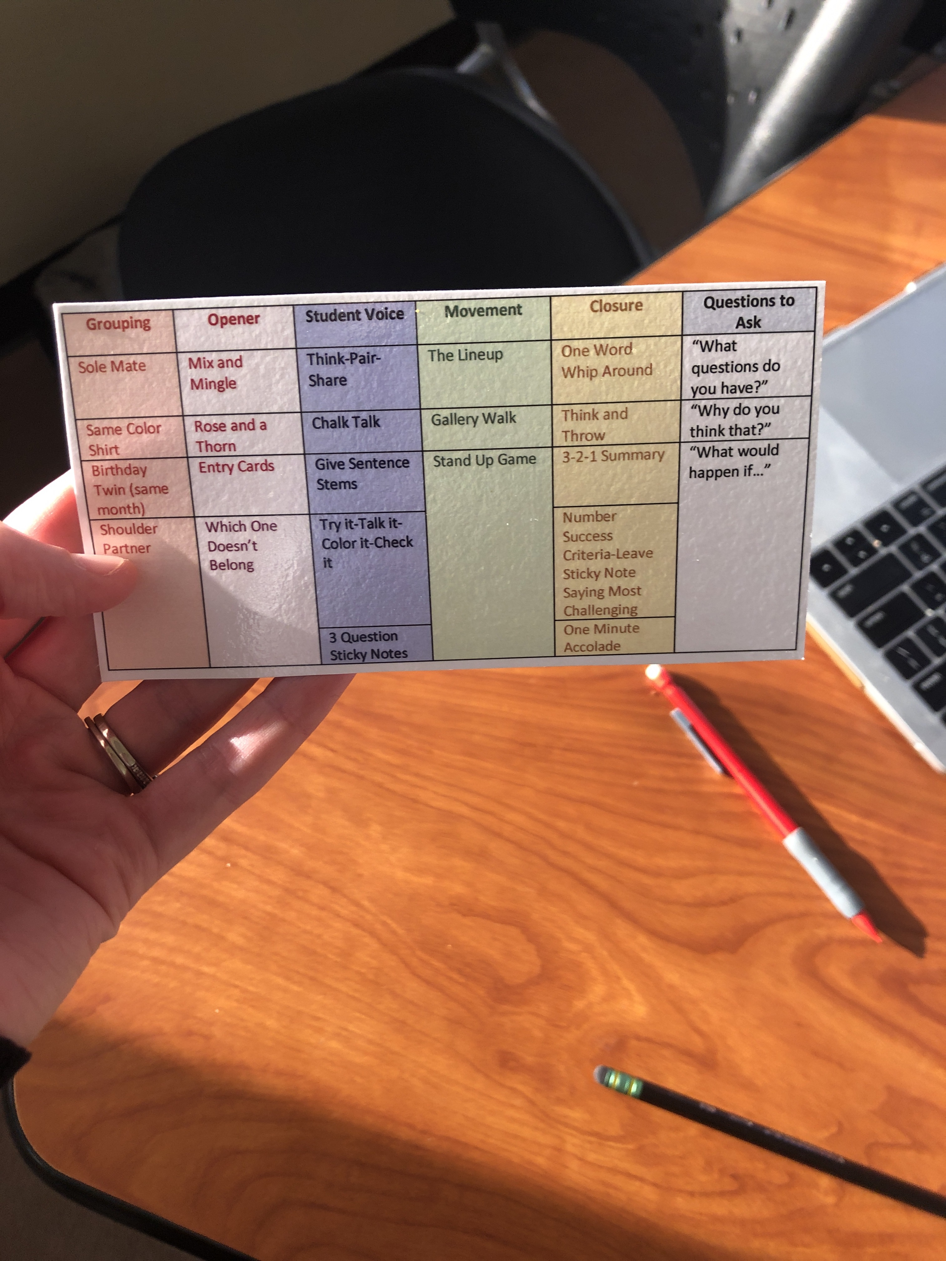 We are full-on in basketball mode at my house as the season started a few weeks ago and my husband had his first game last night (got the W!!) We love letting our boys come early and give them a chance to play behind the scenes before the game. While we were hanging out, my husband showed me his play card he created that he keeps in his pocket during games. He showed me the categories of man sets/defenses, zone, specials, etc. and was explaining that while he obviously knows the plays, when the game gets heated, it’s nice to have this on hand. He said he looks at it for reference of what he’s already called, what would work best in the moment, and also as reminders for plays to call. I started to think, why don’t we have play cards as educators? When we’re in the heart of a lesson, it would be so helpful to have something simple to remind us of ways to bring more student voice, intentional movement, or higher level questioning to the lesson without additional prep. And, just as my husband mentioned it helps him to visually be reminded of what he’s already called, it could help in teaching to vary the strategies for engagement.