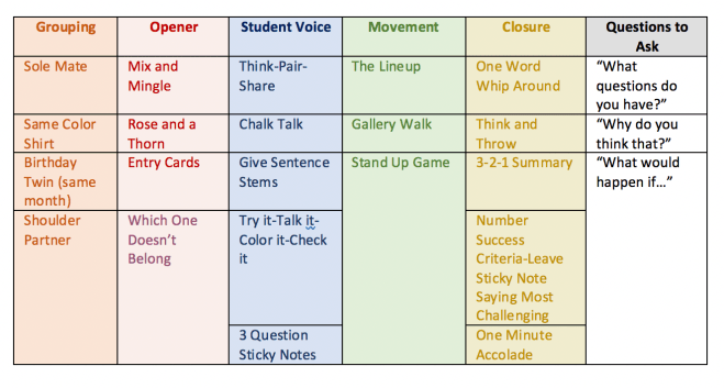 We are full-on in basketball mode at my house as the season started a few weeks ago and my husband had his first game last night (got the W!!) We love letting our boys come early and give them a chance to play behind the scenes before the game. While we were hanging out, my husband showed me his play card he created that he keeps in his pocket during games. He showed me the categories of man sets/defenses, zone, specials, etc. and was explaining that while he obviously knows the plays, when the game gets heated, it’s nice to have this on hand. He said he looks at it for reference of what he’s already called, what would work best in the moment, and also as reminders for plays to call. I started to think, why don’t we have play cards as educators? When we’re in the heart of a lesson, it would be so helpful to have something simple to remind us of ways to bring more student voice, intentional movement, or higher level questioning to the lesson without additional prep. And, just as my husband mentioned it helps him to visually be reminded of what he’s already called, it could help in teaching to vary the strategies for engagement.